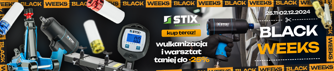 Promocja "Black Weeks" obowiązuje do 02.12.2024 roku. Obniżki cen dotyczą wybranych produktów marki STIX AUTOMOTIVE EQUIPMENT do 25% - liczone od cen detalicznych brutto. Obniżki nie łączą się z innymi akcjami promocyjnymi, przecenami oraz kodami rabatowymi.