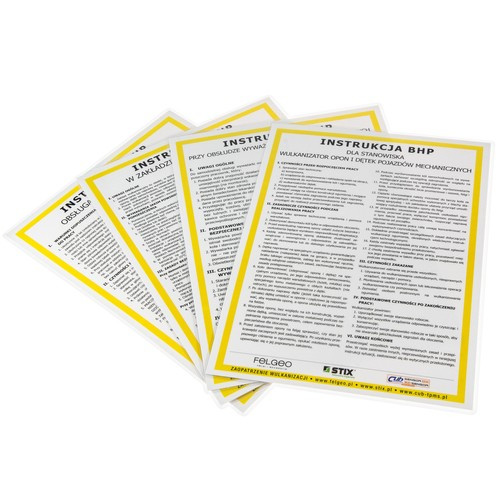 Instrukcja BHP, jaką znajdziecie w ofercie Felgeo wydana jest w formie laminowanej, dlatego nie ma obaw o to, że w warsztacie, gdzie panują trudne warunki, zostanie szybko uszkodzona. Zapraszamy do naszej oferty, dbajcie o to, w jakich warunkach pracujecie, by waszym udziałem nie stało się tak popularne w naszym kraju przysłowie: Mądry Polak po szkodzie.