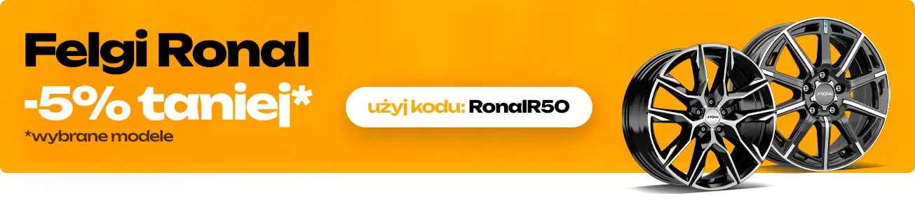 Kod rabatowy "RonalR50" obowiązuje do 30.06.2025 roku lub do wyczerpania zapasów. Obniżki cen dotyczą wybranych modeli felg marki RONAL i wynoszą do -10%. Obniżki nie łączą się z innymi akcjami promocyjnymi, przecenami oraz kodami rabatowymi. Rabat w wysokości -10% przysługuje dla wybranych felg z modelu RONAL R50, natomiast na pozostałe modele felg aluminiowych marki RONAL przypada rabat w wysokości -5%.